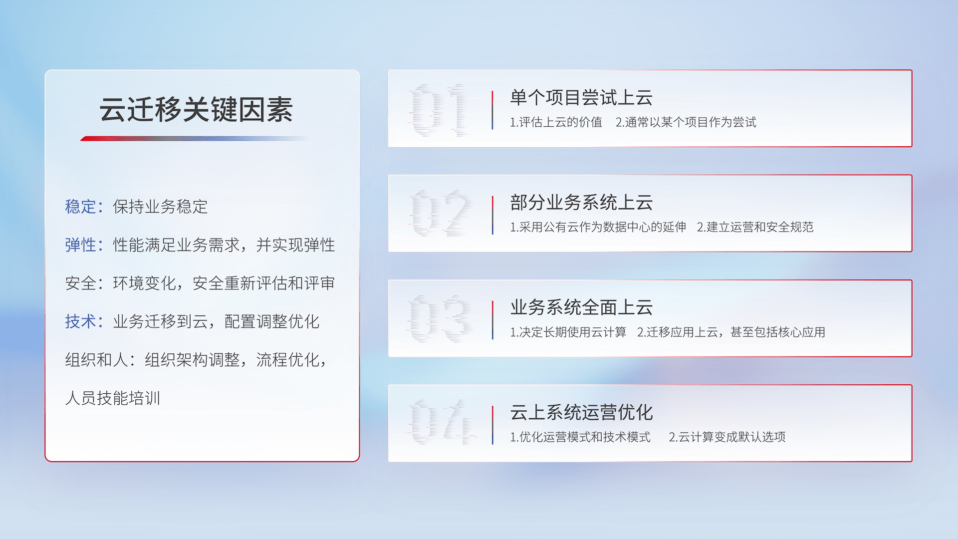 结合实际业务,,,从规划设计、、、云平台选型、、、云原生改造、、数据迁移、、、、集成交付,,,,迁移全过程为客户识别最佳上云路径,,做好风险识别管理,,,,设计网络架构、、、身份权限、、、、安全审计合规、、操作审计、、、日志审计、、、、监控告警策略、、、多站点容灾设计等,,,对云上基础设施进行整体规划,,,提升IT治理水平,,,,以满足弹性、、高可用、、、高性能的需求。。