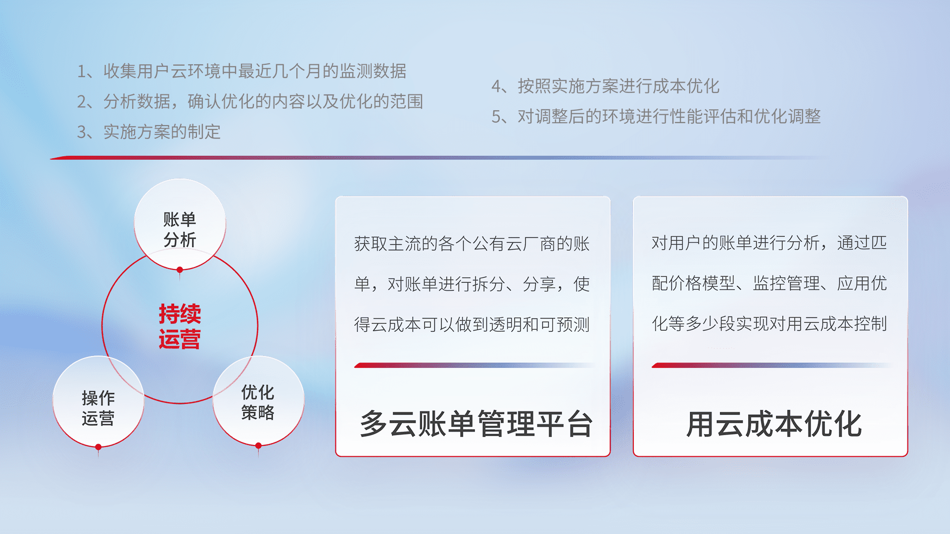 通过多云纳管,,以统一的资源数据模型把客户的云资源进行抽象和封装,,进而实现对多云资源的统一操作,,,,保障云资源管理的可靠性、、、稳定性与可用性。。量身定制化运维内容,,,配置、、、开发运维、、补丁管理、、备份、、监控、、、、认证和访问管理、、、、审计和日常巡检等,,保障在用云过程中的可靠度,,,稳定度以及高可用率。。。